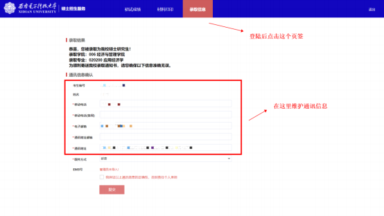 2.登录后选择录取信息模块进行通讯信息确认。注意,只能在要 求的时间范围内进行通讯信息确认。